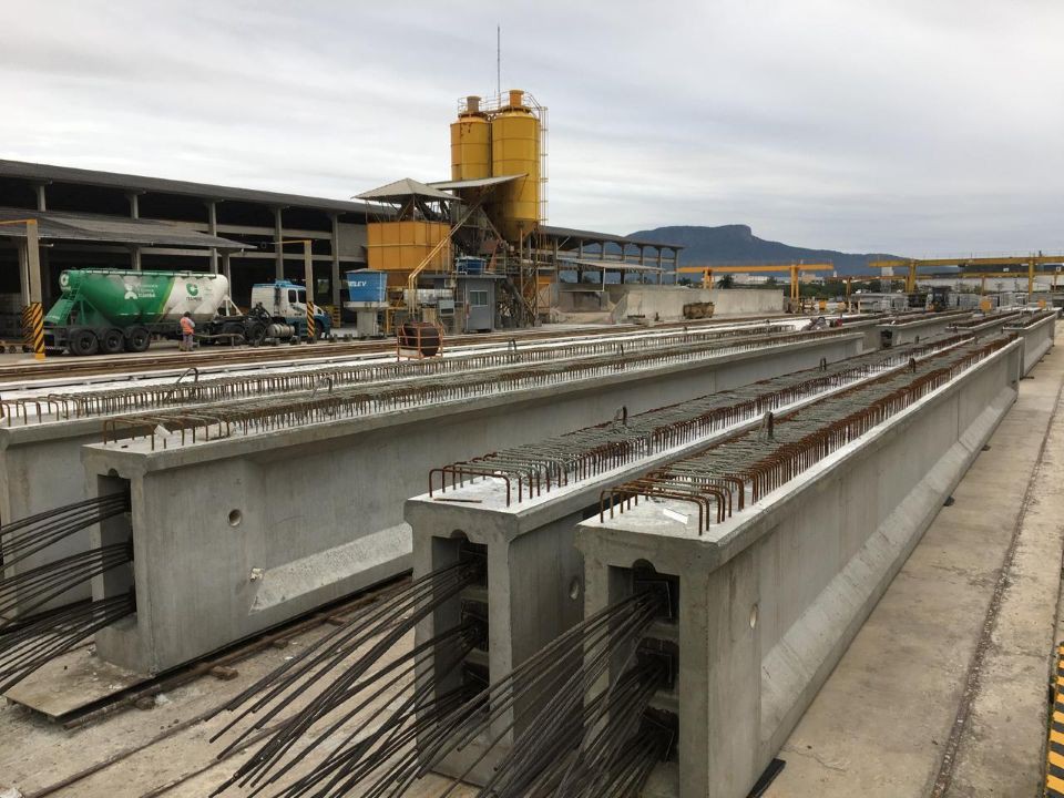 As vigas são pré-fabricadas em pistas de protensão com formas metálicas, concreto de alto desempenho e com aplicação precisa da força de protensão.